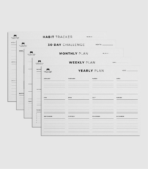 - 1 pack of trackers (22 sheets): 1 yearly plan, 3 monthly plan, 12 weekly plan, 3 30-days challenge, 3 habit trackers (15 weeks).